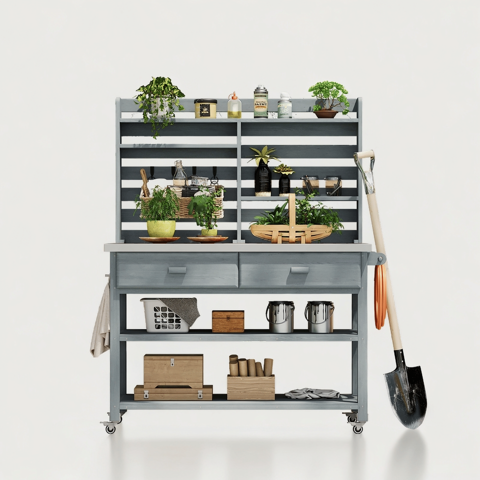 Isola Cucina da Esterno in Legno Massello con Ripiano Superiore e Ruote Bloccabili, 165 cm di Altezza, Banco da Giardinaggio con Vano Portaoggetti in Acciaio Inossidabile