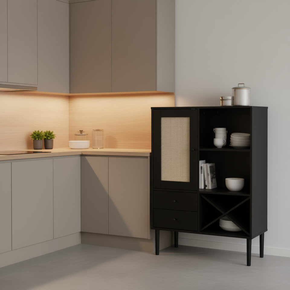 Mobiletto alto da cucina nero 35.4x15.7x44.1 pollici effetto rattan con ripiani per cucina