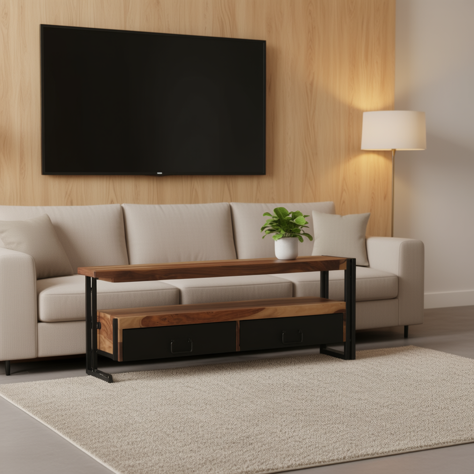 Solid Wood Sheesham TV Stand 47.2x11.8x15.7 Inch Industrial Modern Design Floor Mount Living Room Furniture