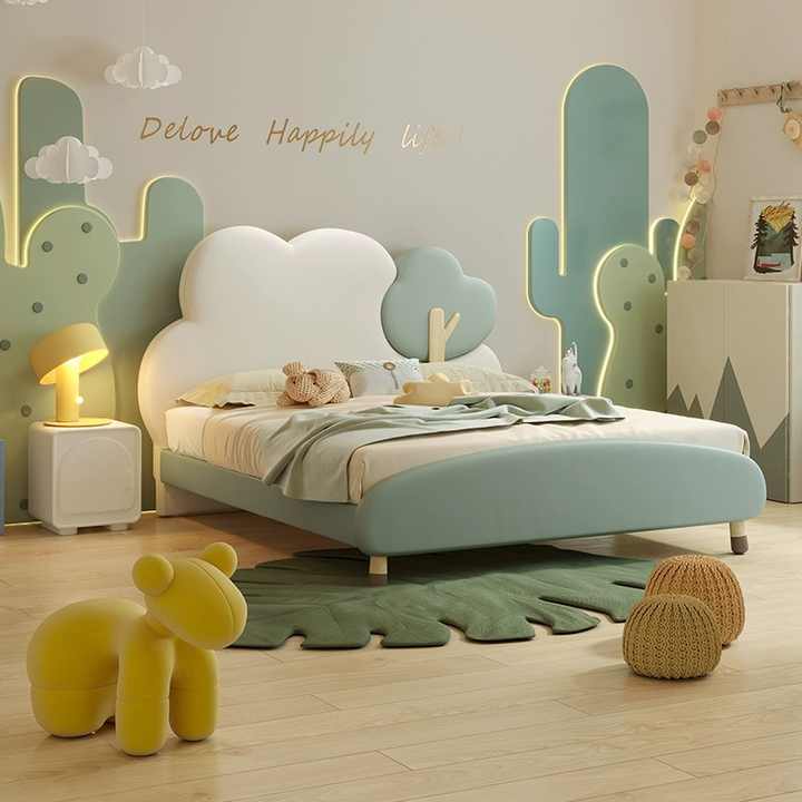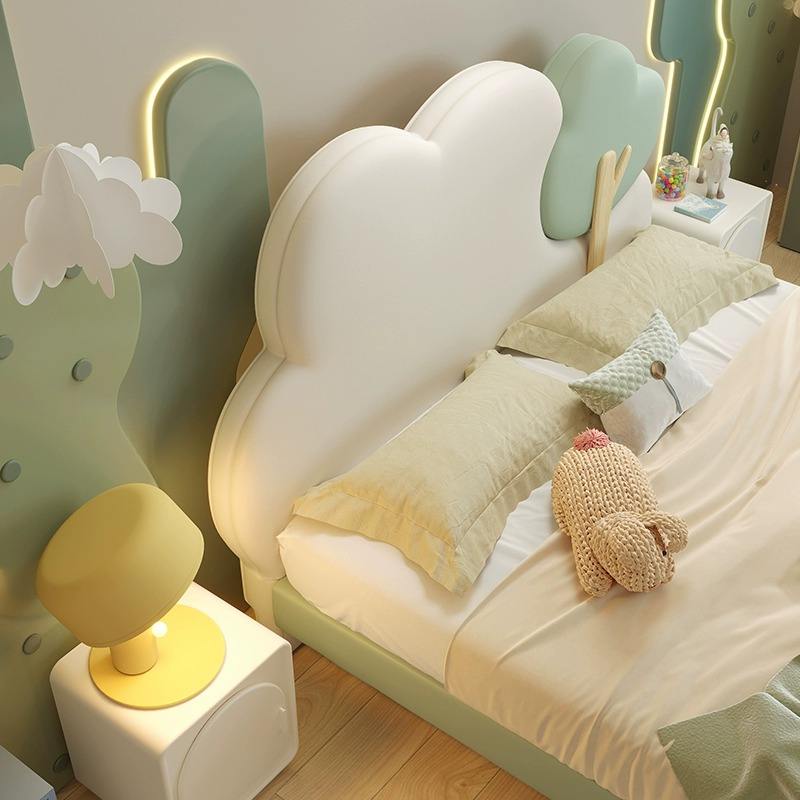 Letto Singolo per Bambini in Legno Massello con Design a Nuvola, Adorabile Mobile per la Camera da Letto con Struttura e Schienale Rivestiti in Pelle