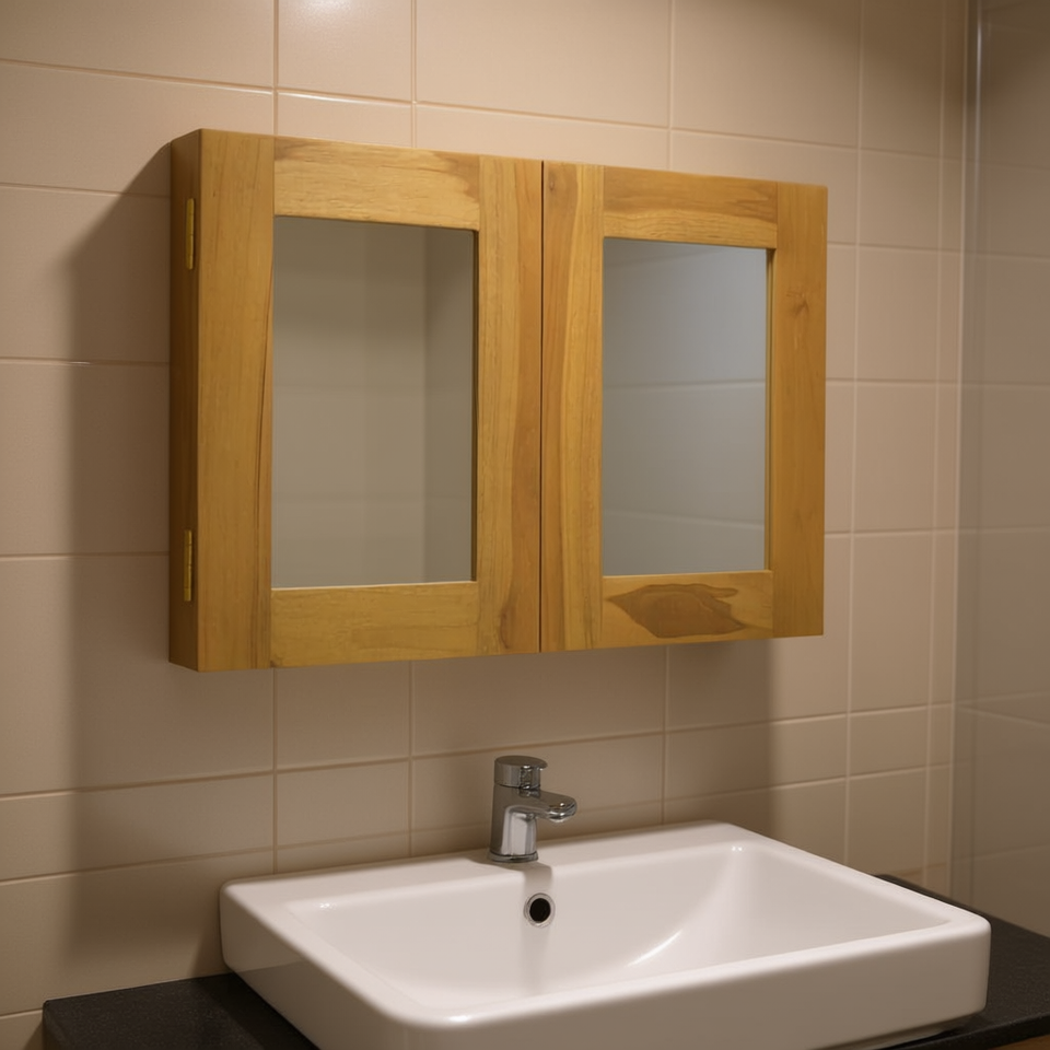 Armadietto a Specchio per Bagno in Legno Massello di Teak 23.6x3.9x15.7 Pollici, Montaggio a Parete, Contenitore Rettangolare per Bagno con Specchi in Vetro