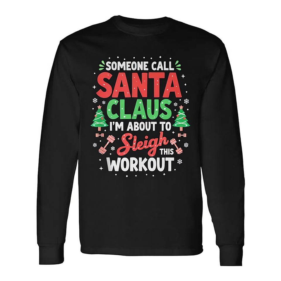 Maglietta Promozionale Natalizia a Maniche Lunghe con Stampa 'C'incammina' con Babbo Natale sulla Slitta' per Allenamento e Fitness