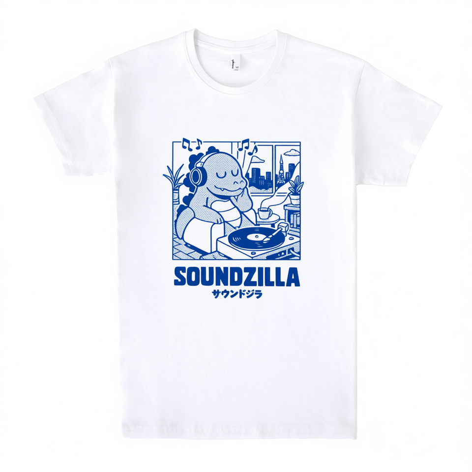 T-shirt Soundzilla bianca blu con design grafico, maglietta promozionale unisex