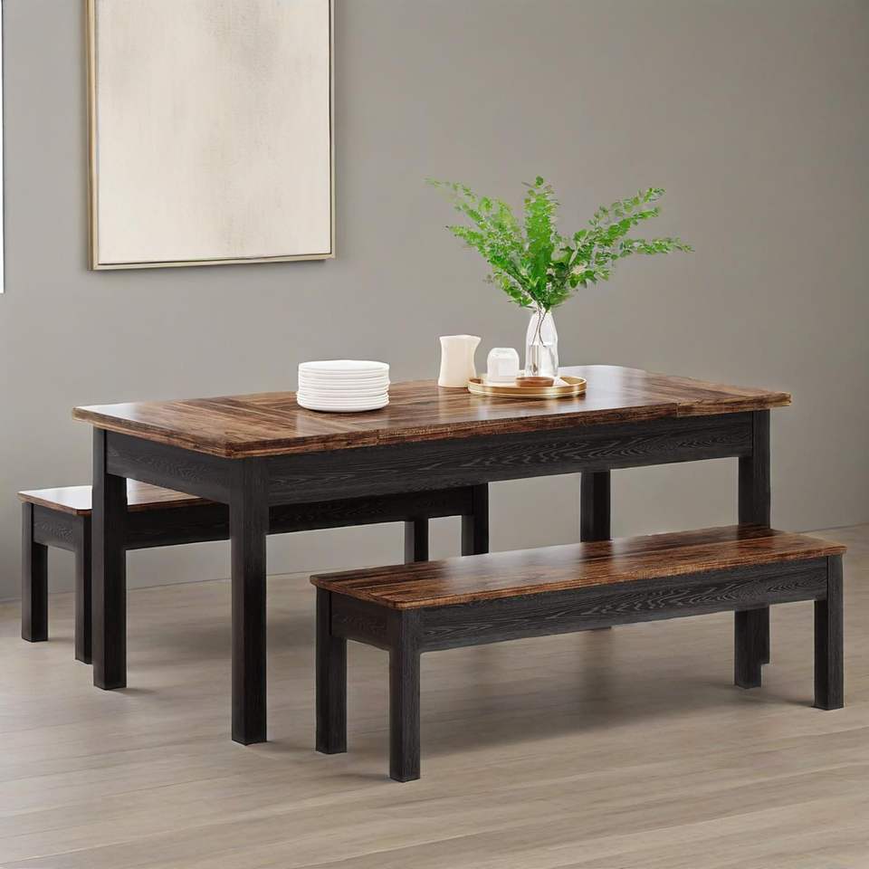 Set da Cucina Salvaspazio in Stile Rustico a 3 Pezzi per 4-6 Persone, Tavolo da Pranzo in Legno Resistente da 55 Pollici con 2 Panche per Sala da Pranzo