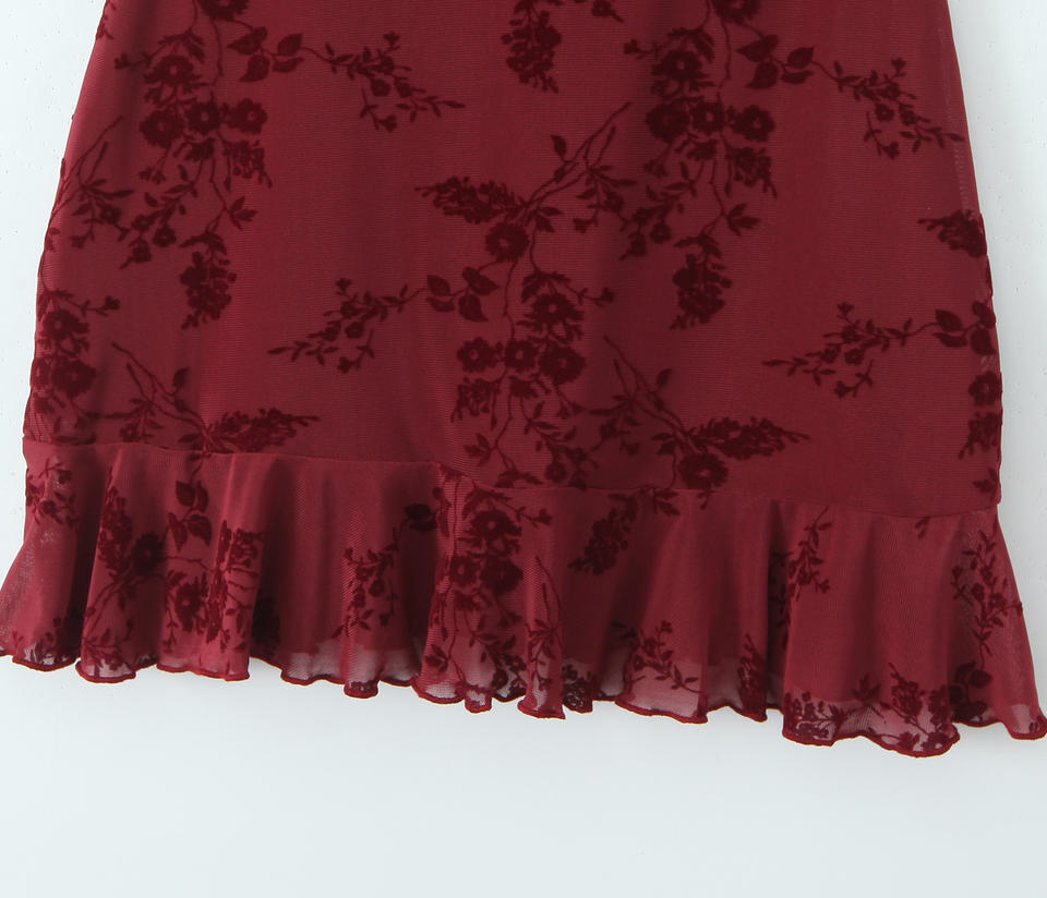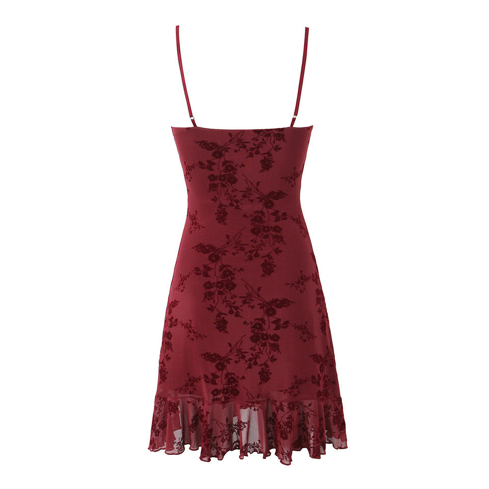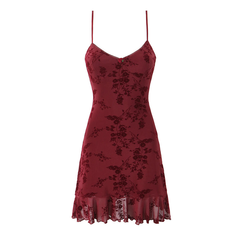 Abito Mini Slip Casual alla Moda con Spalline Sottili, Motivo Floreale e Colore Bordeaux per Donne