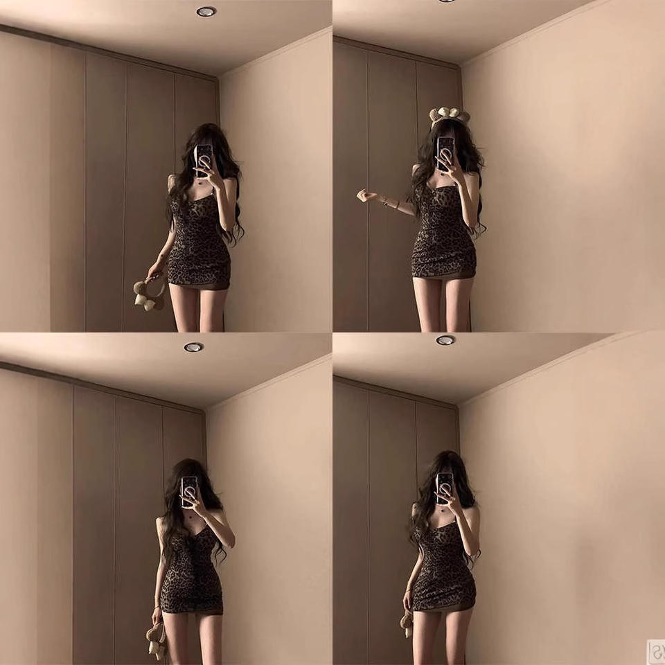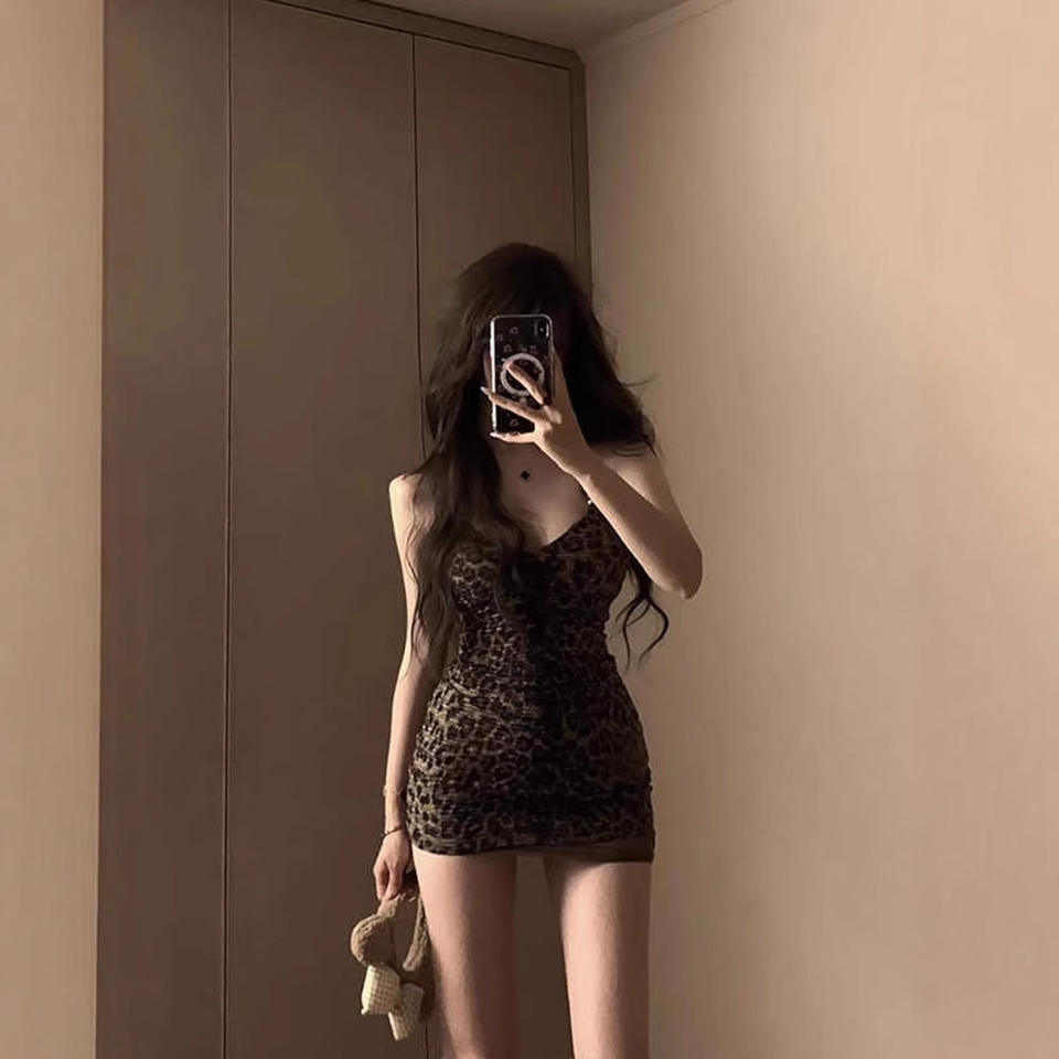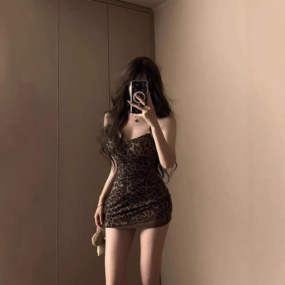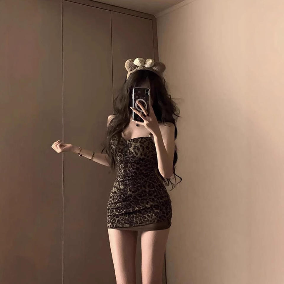 Abito Halter Leopardato Spice Girl da Donna, Corto, Aderente, Senza Schienale, con Gonna Corta e Fascia in Vita, per Autunno S Bdbh