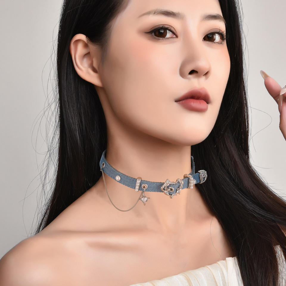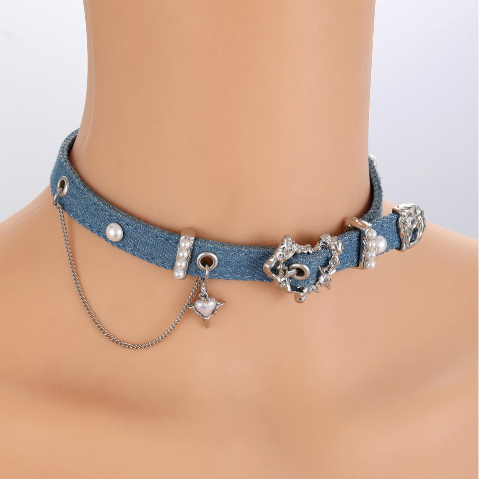 Spicy Girl Cowboy Series Peach Heart Buckle Blue Choker Necklace Women's Accessories Jewelry