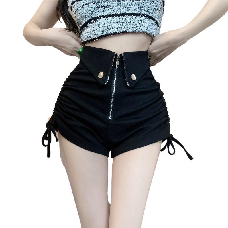 Shorts Casual da Donna a Vita Alta con Coulisse, Gamba Dritta, Stile Spicy Girl, Collezione Autunno 2023, Hot Pants Neri in Fibra di Poliestere, Taglia Petite, Vestibilità Regolare