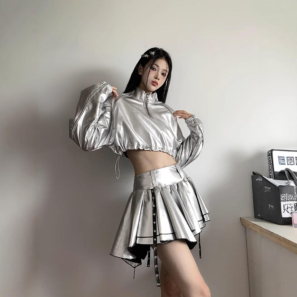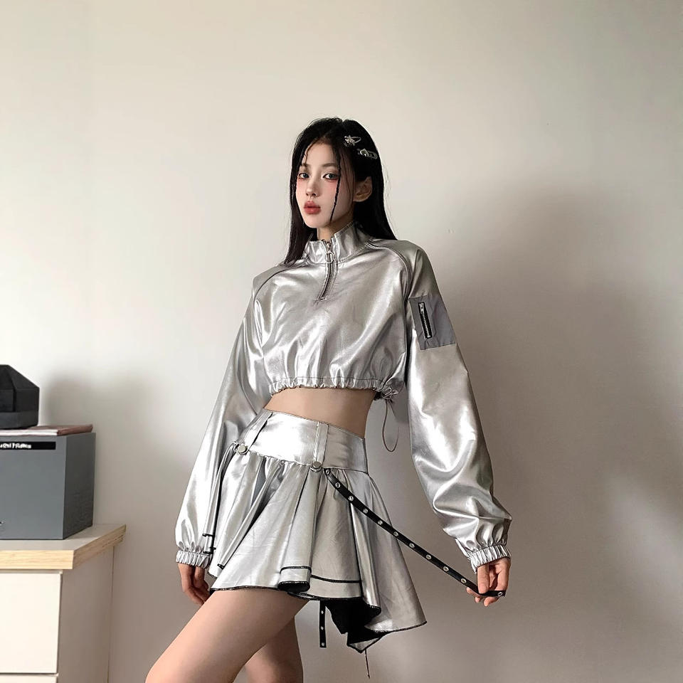 Spicy Girl Silver Cotton Long-sleeve Cropped Sweatshirt High-waist Skirt Performance Jazz Dance DS Street Dance Women's Outfit