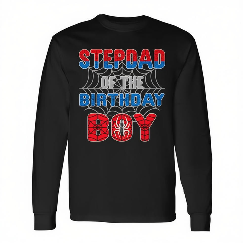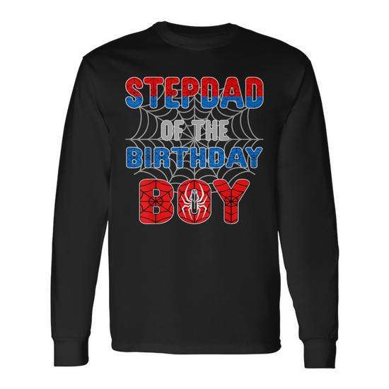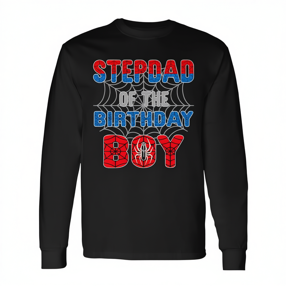T-shirt a maniche lunghe Spider Web Stepdad Of The Birthday Boy per adulti, girocollo, stampa serigrafica, per feste e riunioni di famiglia