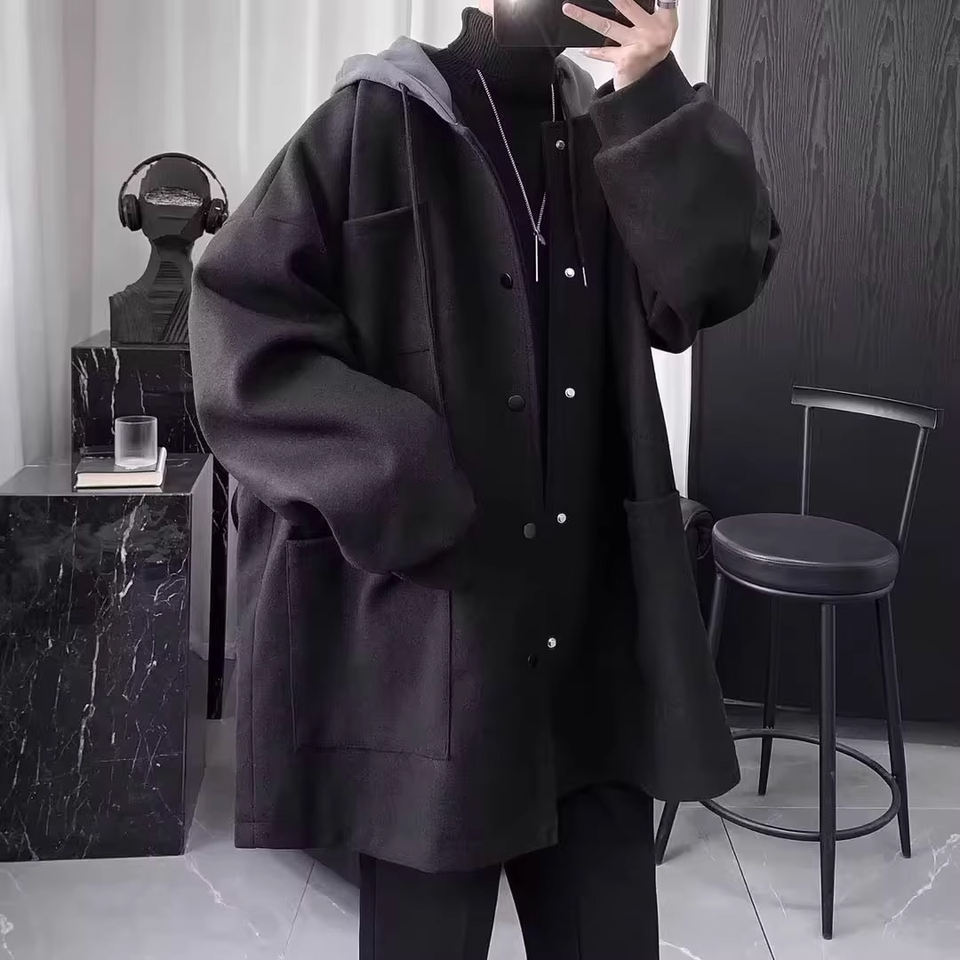 Spiv Men's Casual Hooded Quilted Canvas Jacket Windproof Horn Button Solid Pattern Long Autumn Season Relaxed Fit Plain Dyed
