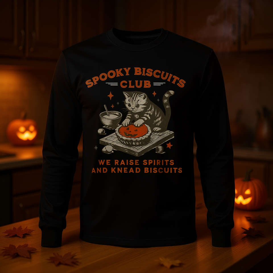 T-shirt a maniche lunghe Spooky Biscuits Club con design gatto di Halloween e tema Biscotti Impastati
