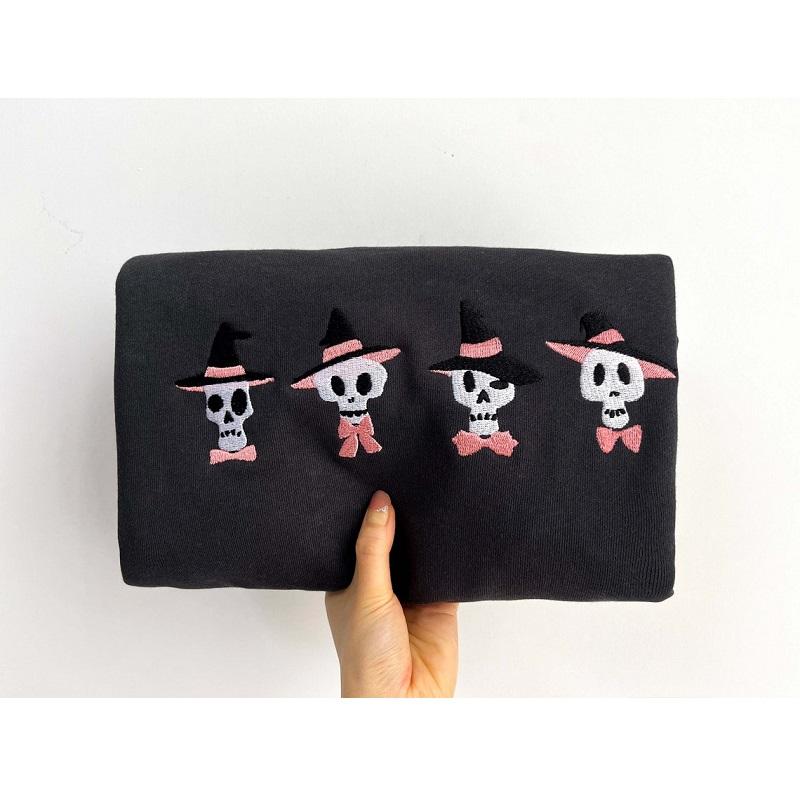 Stagione spettrale divertente scheletro rosa felpa ricamata di Halloween con fiocco e cappello