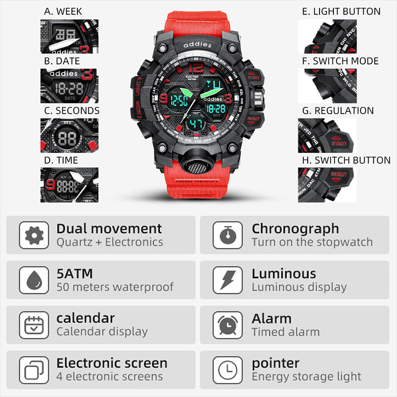 Caratteristica:Giorno/data, Resistente all'acqua, Display A LED, Luminoso, Settimana di Visualizzazione, Mani luminose, Resistente agli Urti, Cronometro, Luce posteriore