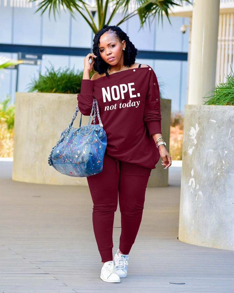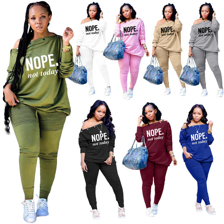 Completo Due Pezzi Primavera 2022 per Taglie Forti, Stampa 'NOPE', Spalla Obliqua, Manica Lunga, Decorazione con Borchie
