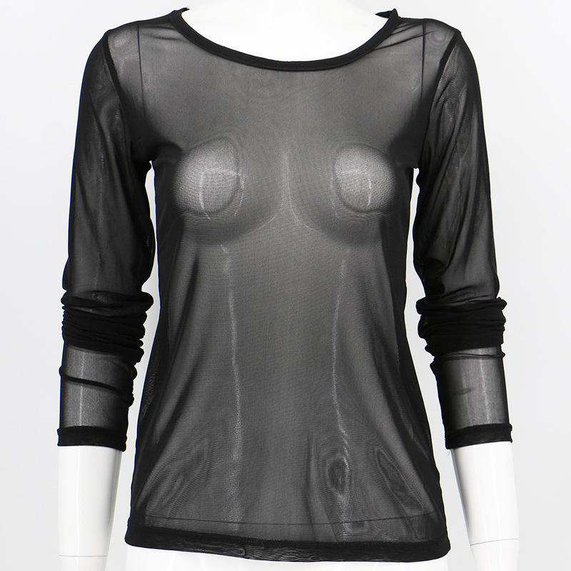 Camicia a Maniche Lunghe da Donna in Rete Trasparente Nera con Inserti, Super Elastica, Sottile e Sexy, per Primavera e Autunno