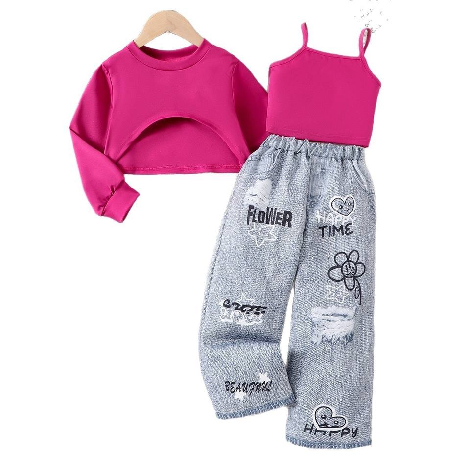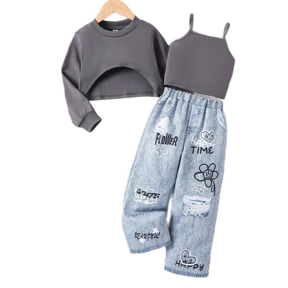 Abbigliamento all'ingrosso per bambini primavera autunno: T-shirt a maniche lunghe a tinta unita, gilet e jeans per bambine