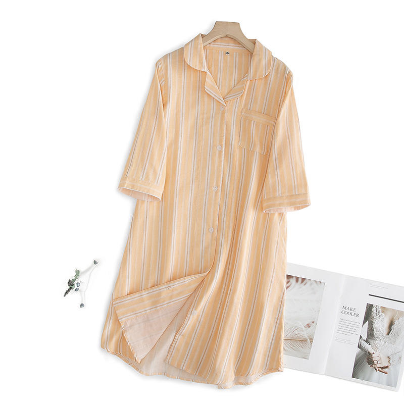Spring Summer Autumn Casual Soft Half Sleeve 100% Cotton Women Striped Woven Shirt Dress Breathable Nightgown