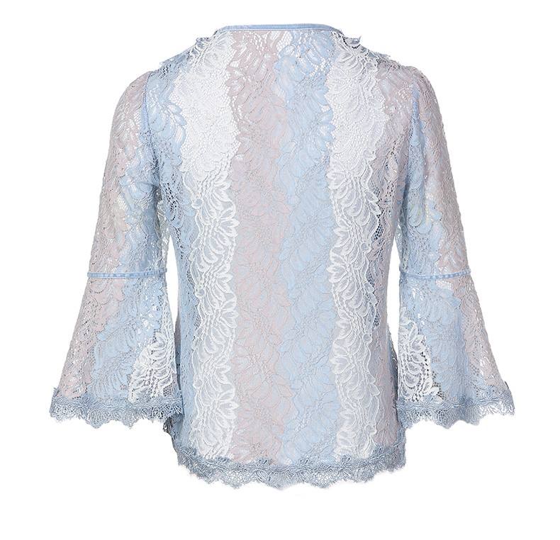 Camicia primavera estate donna Vintage collo a V blu Falbala balze camicia a maniche lunghe in pizzo Chiffon floreale in Chiffon