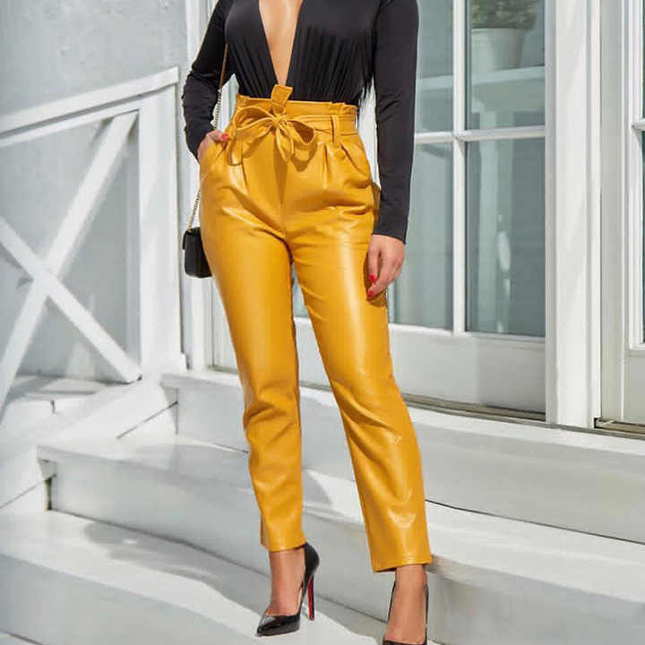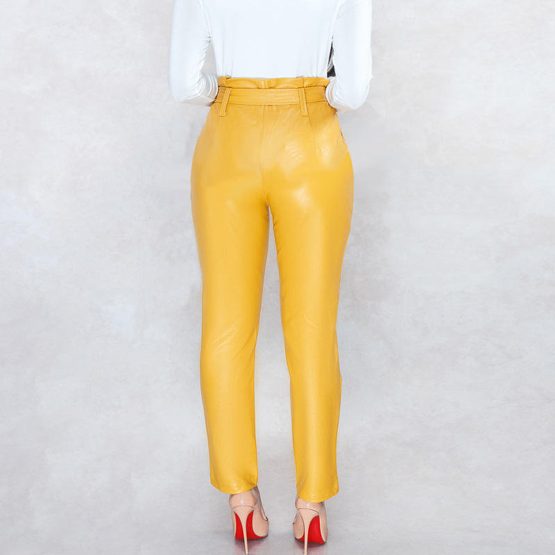 Pantaloni primaverili da donna in pelle brillante 2020, nuovi pantaloni da donna alla moda, pantaloni gialli eleganti a vita alta