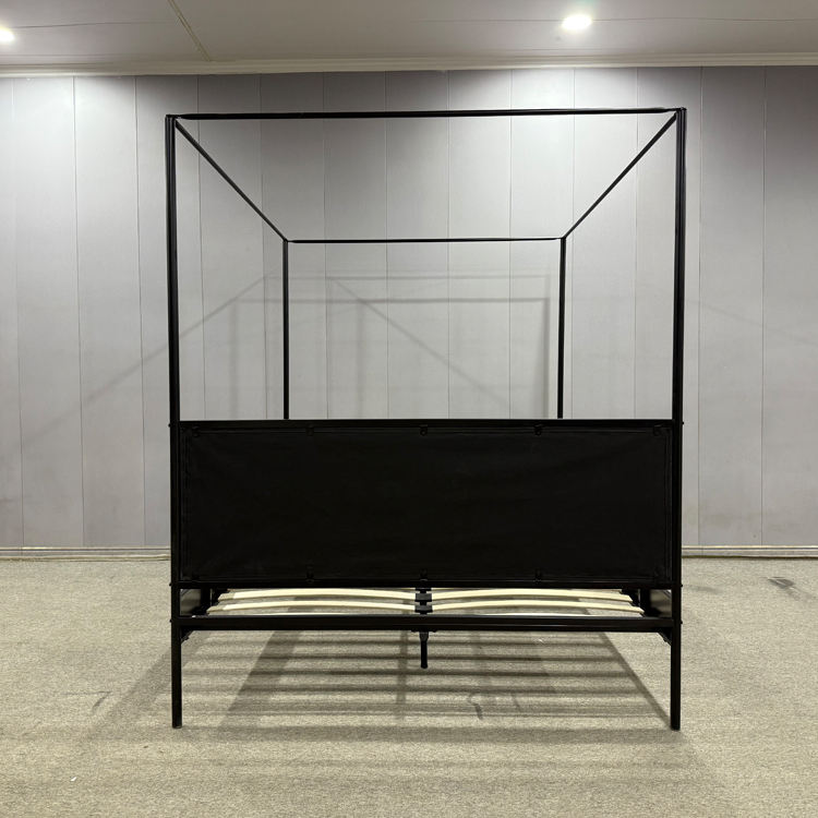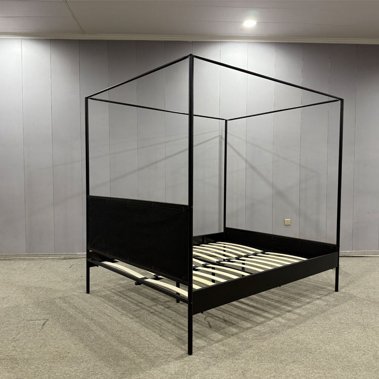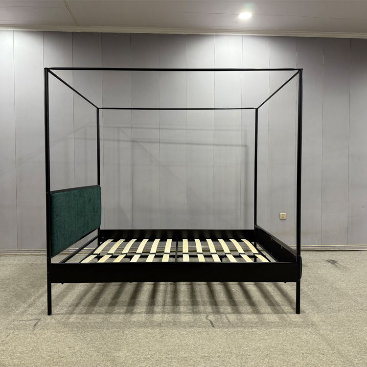 Struttura a baldacchino matrimoniale in metallo quadrato con testiera imbottita in tessuto verde scuro, colore personalizzato, mobili per camera da letto