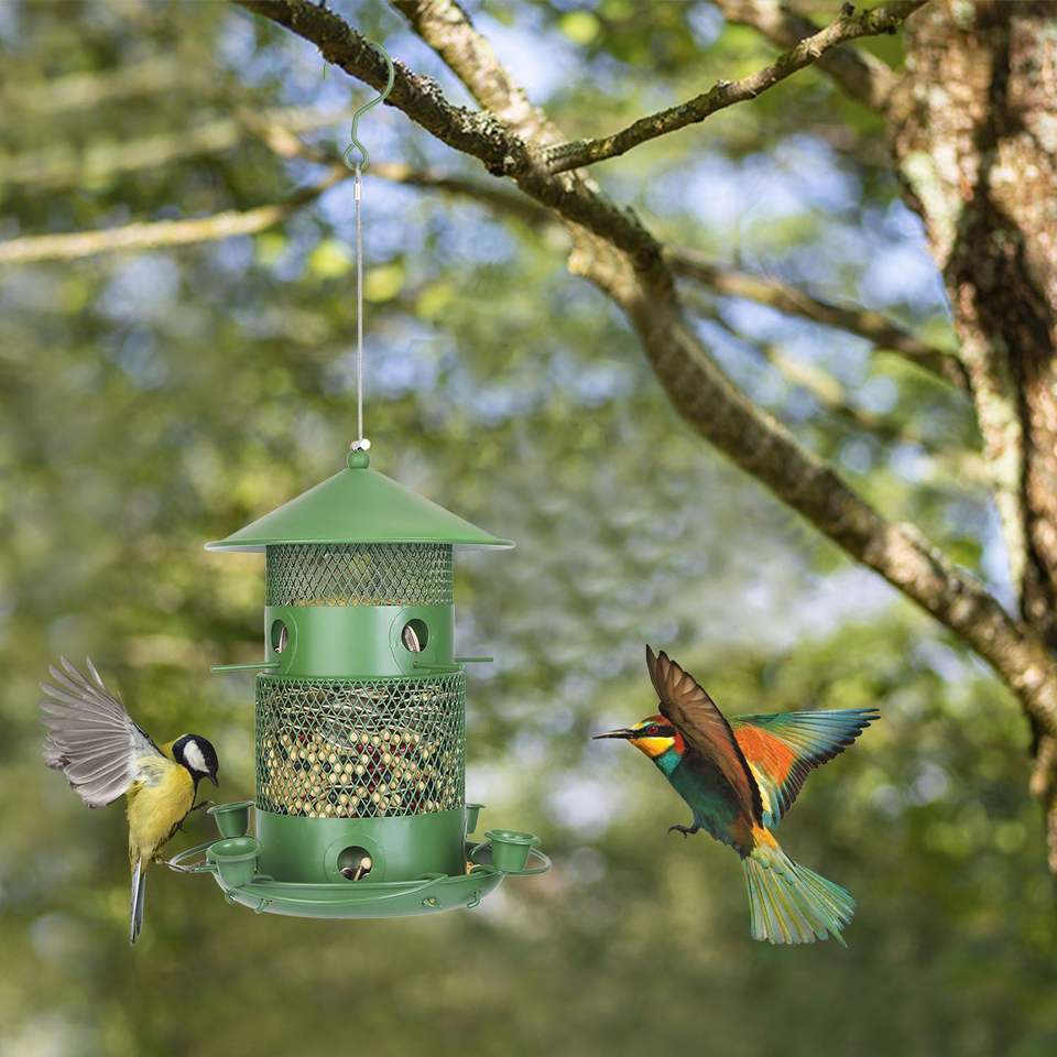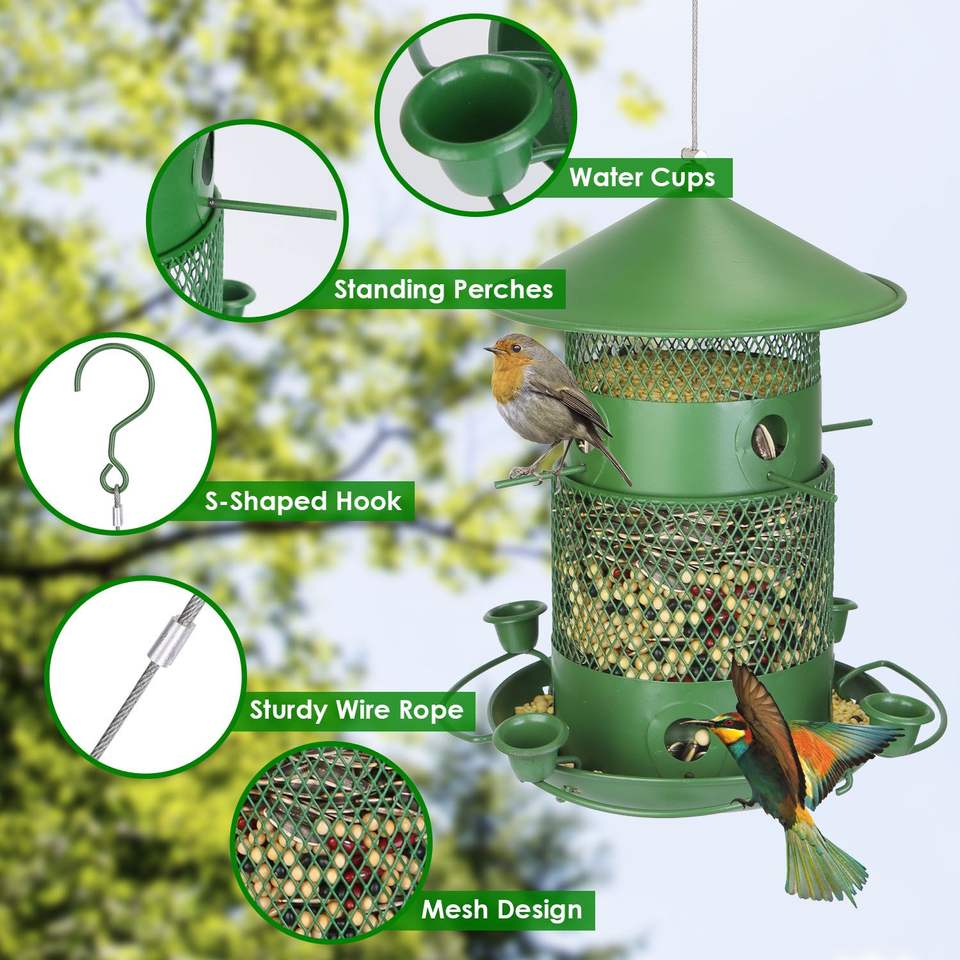 Mangiatoia per Uccelli in Metallo Anti-Scoiattolo e Anti-Morso con Posatoi Circolari a 360 Gradi, da Esterno, Sospesa, per Uccelli Selvatici