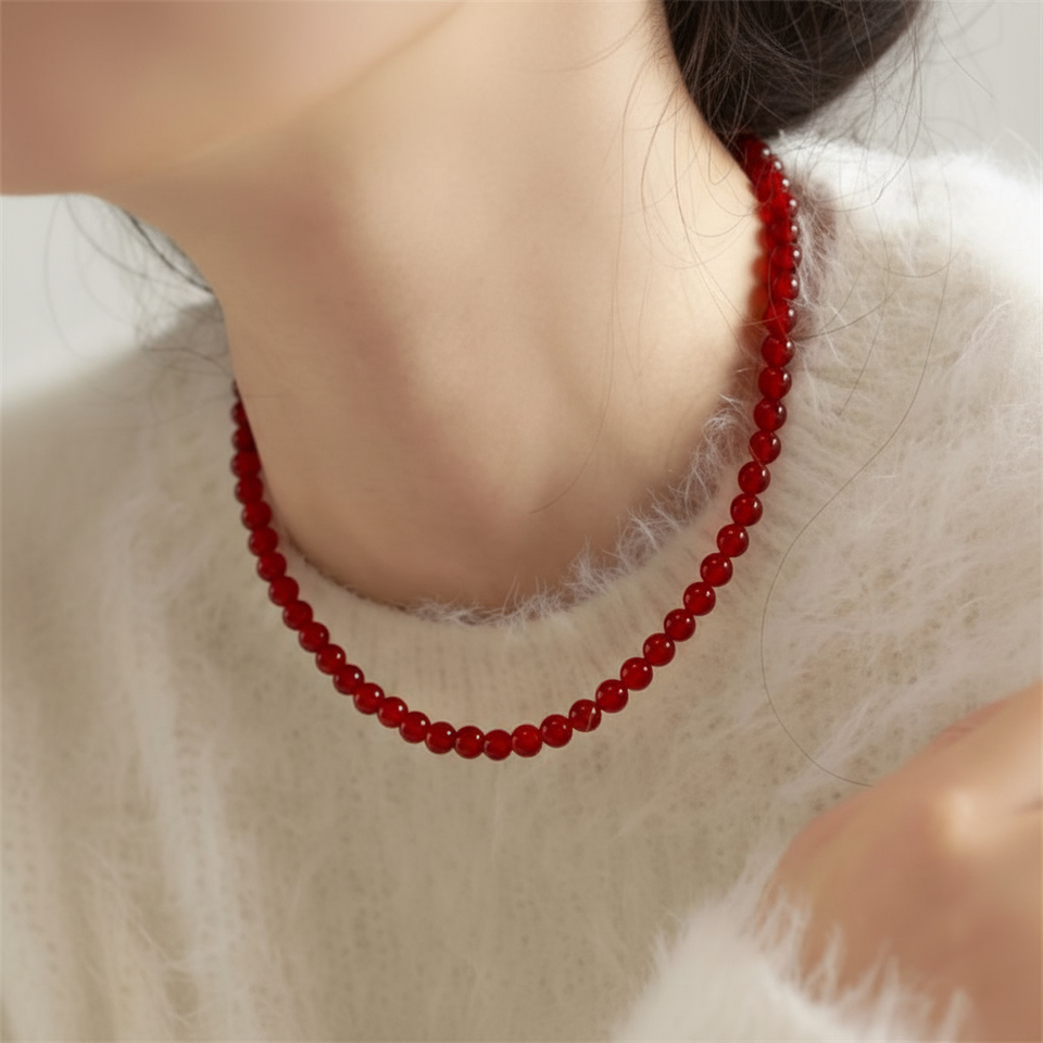 Sseuredam Summer Necklace with Red Ball Beads Raw Stone and Onyx Fashionable Beaded Accessory