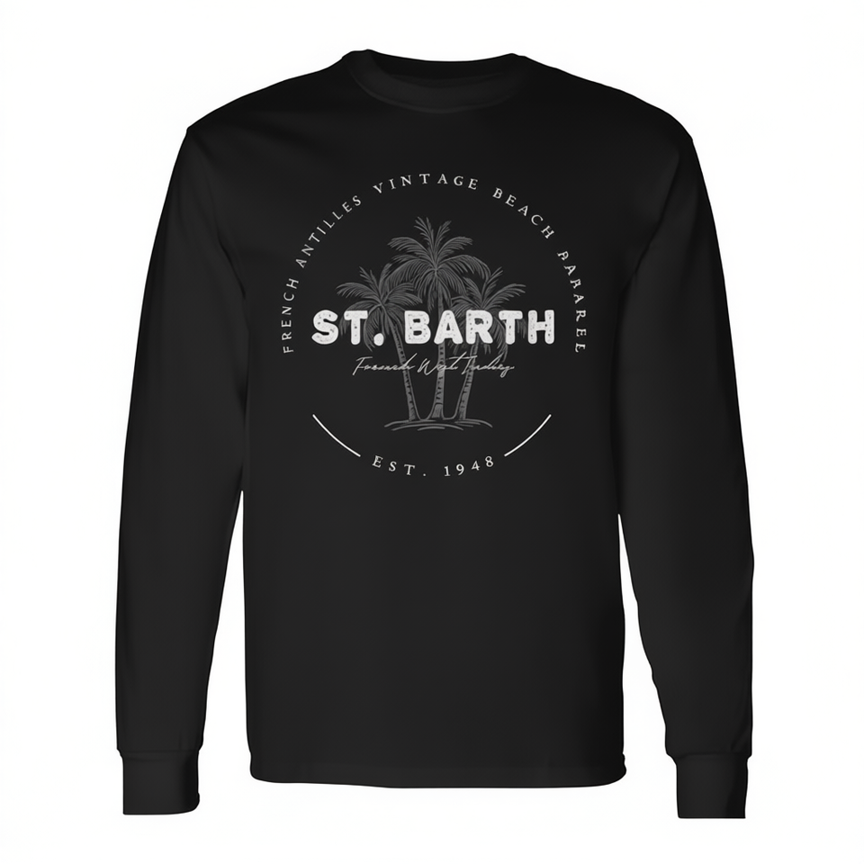 T-shirt a maniche lunghe St. Barth con design vintage a palme da spiaggia, nera