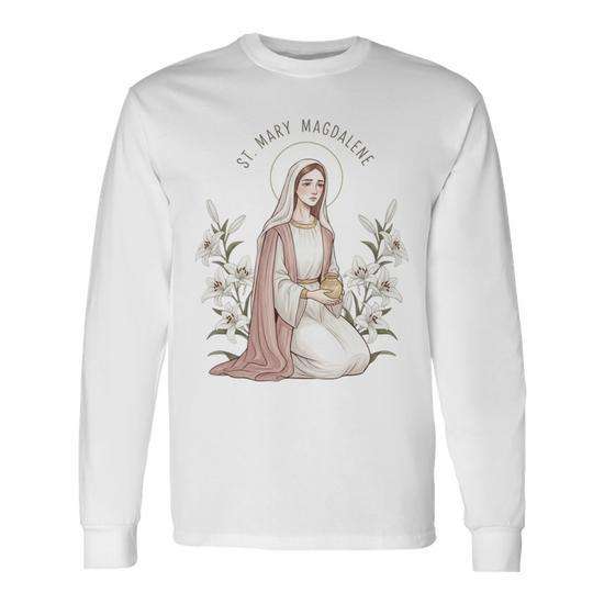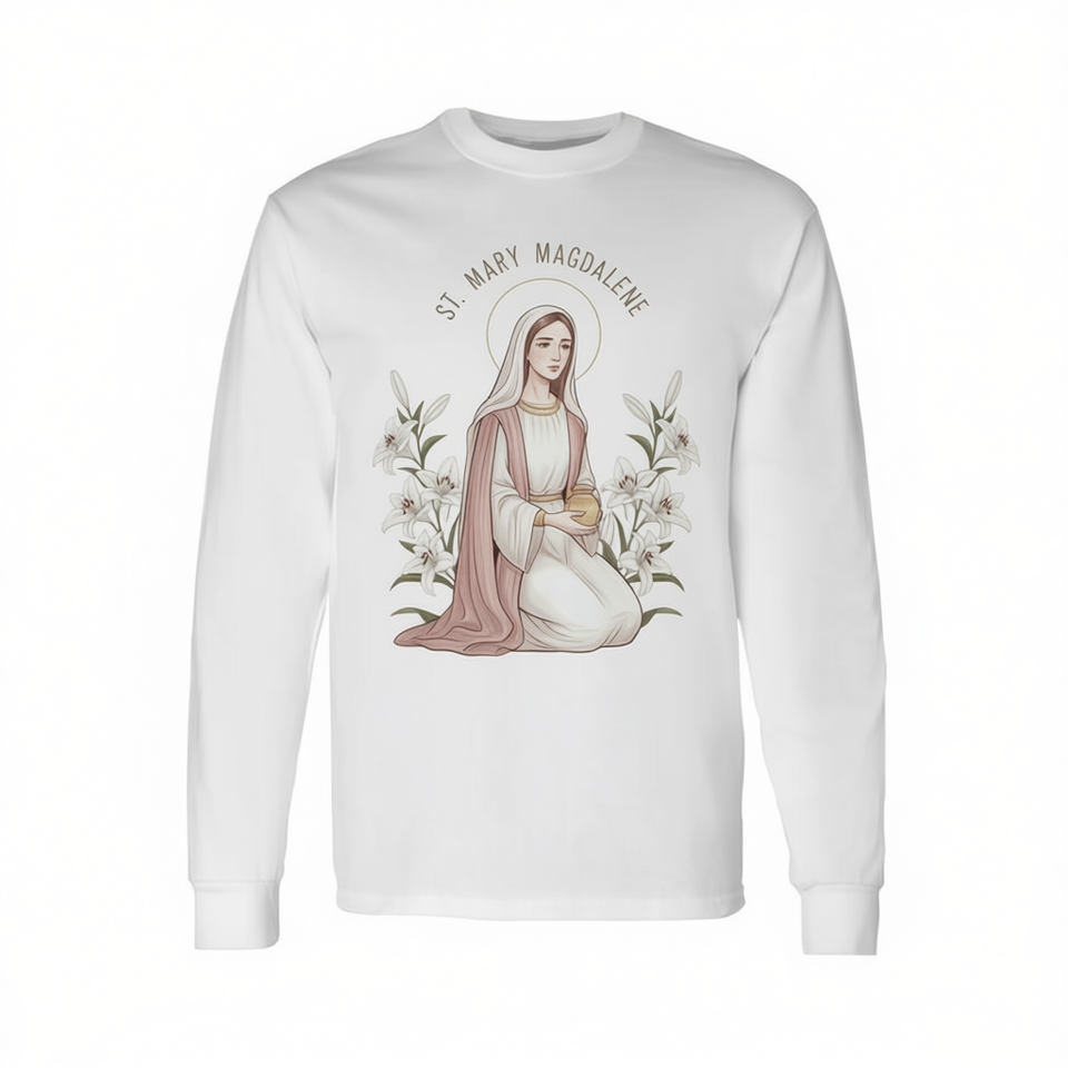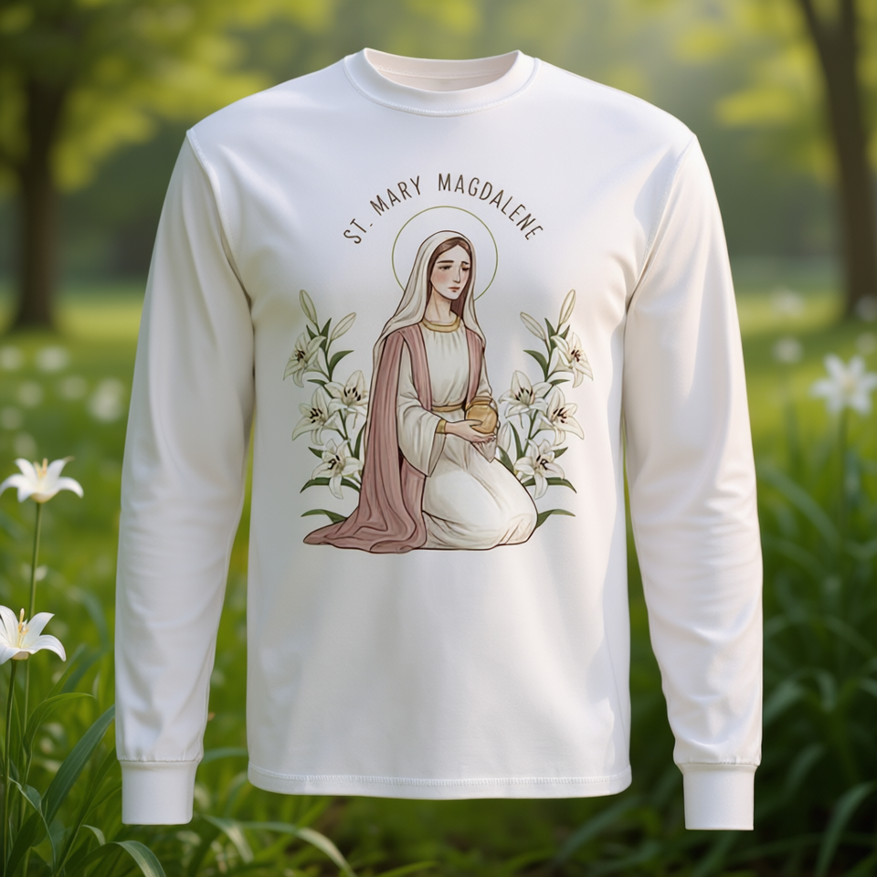 Maglietta a Maniche Lunghe Santa Maria Magdalena con Design a Giglio, Abbigliamento per Devozione Pasquale