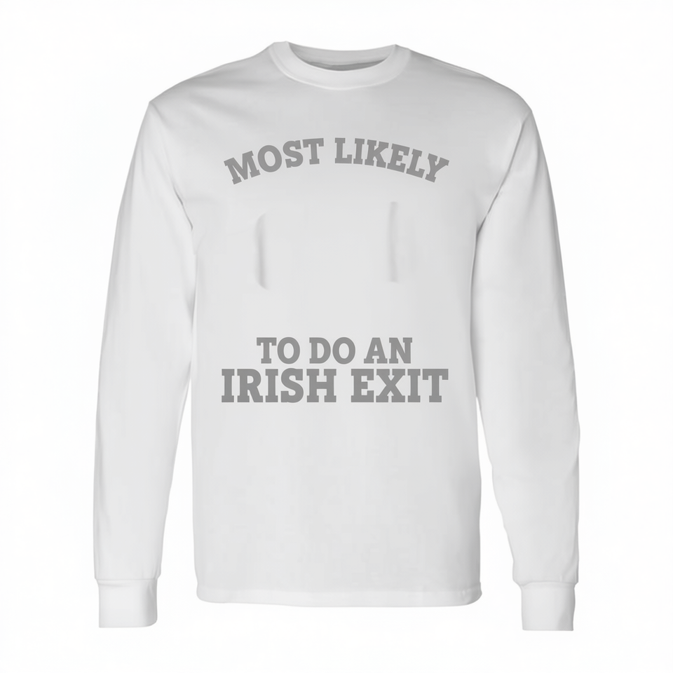 Maglietta a maniche lunghe per il Giorno di San Patrizio con stampa 'Most Likely to Do an Irish Exit' - Per uso promozionale
