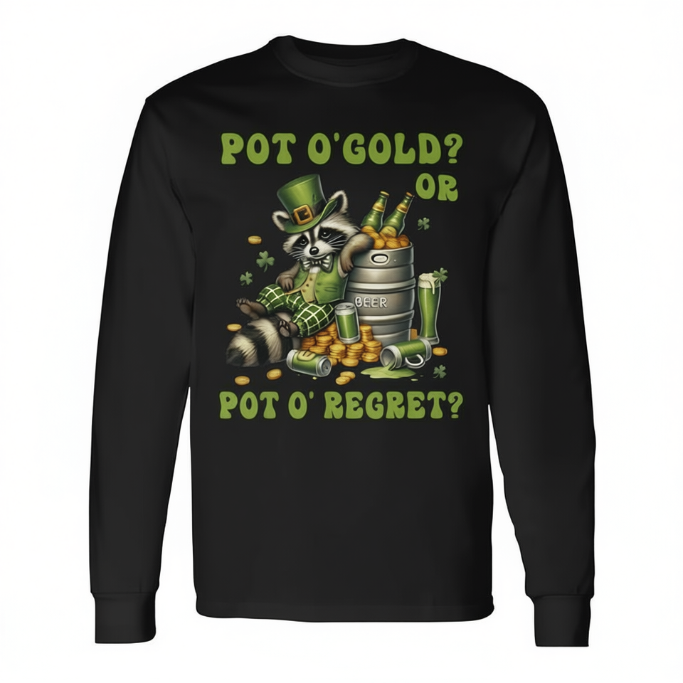 Maglietta a maniche lunghe per il Giorno di San Patrizio con stampa Pot O'Gold o Pot O' Regret, abbigliamento promozionale con procione e birra