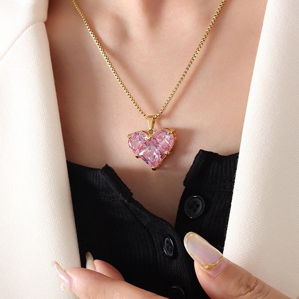 Stainless Steel 18K Gold Plated Zircon Love Heart Pendant Necklace Earrings Titanium Steel Chunky Pink Necklace Earrings Set