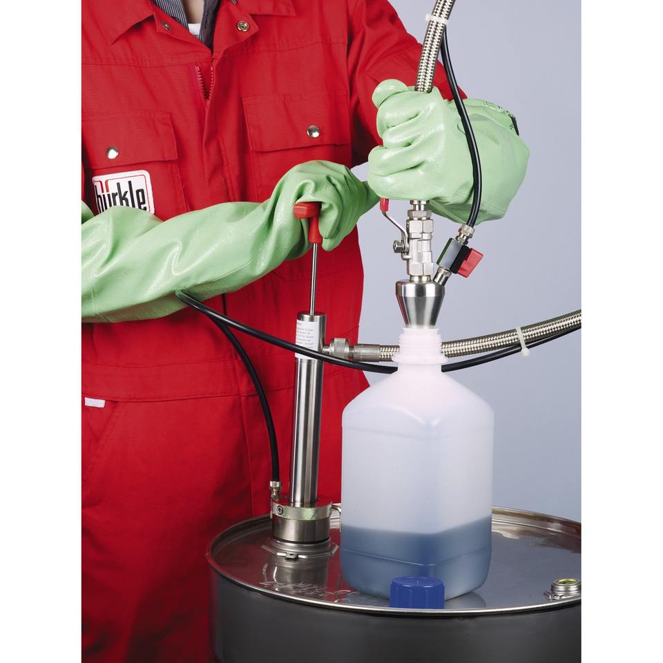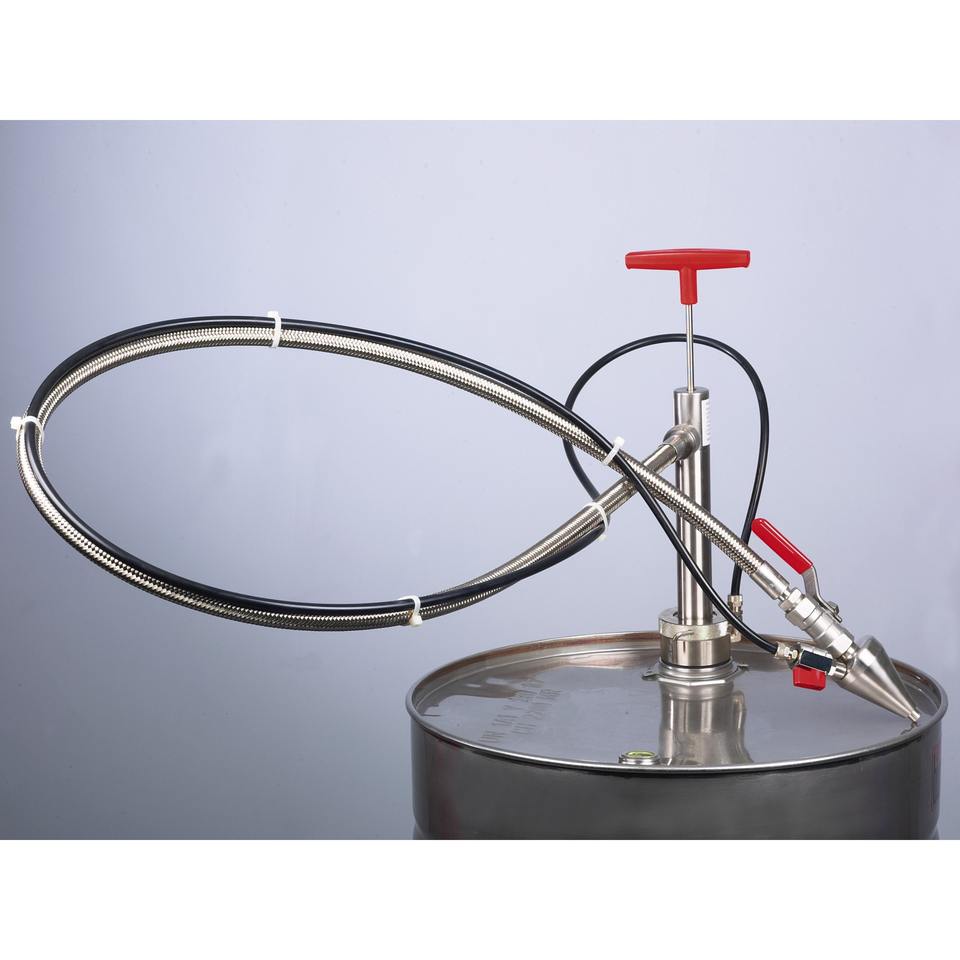 Gas-tight stainless steel drum pump with discharge hose and shut-off valve - Bürkle