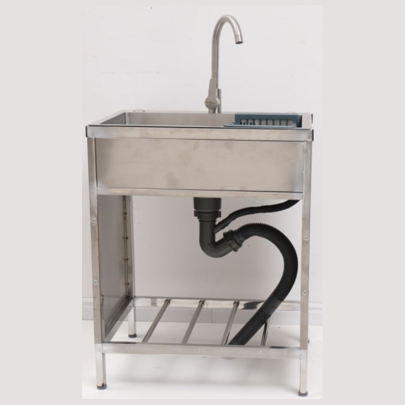 Stainless Steel Laundry Tub With Storage Shelf Single Bowl Kitchen Sink With Circular Faucet Cold and Hot Water Inlet Pipe