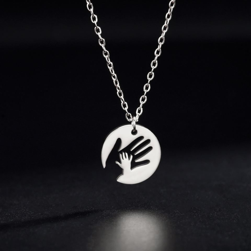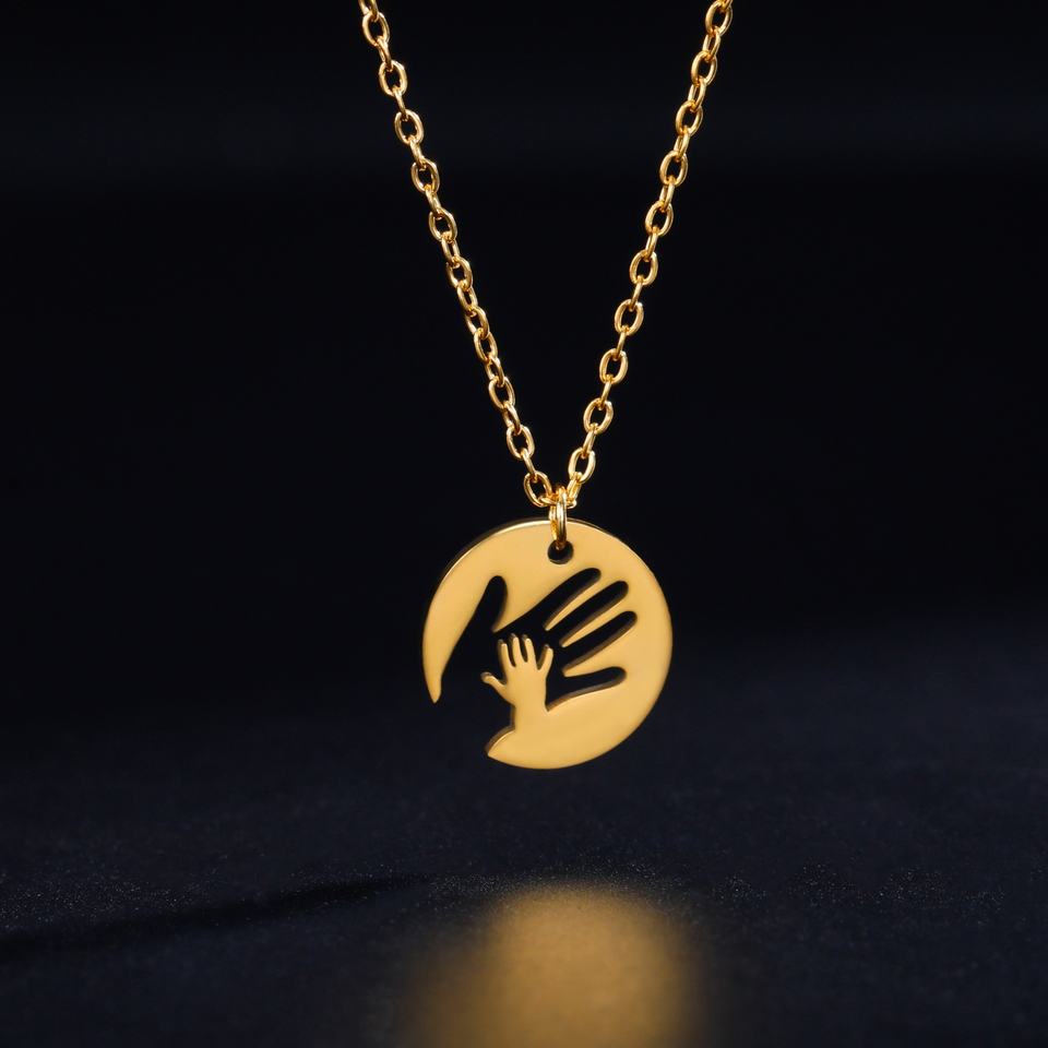 Stainless Steel Round Pendant Necklace Gold Plated Trendy Choker Jewelry for Baby Mom Maternal Love Handshake Design