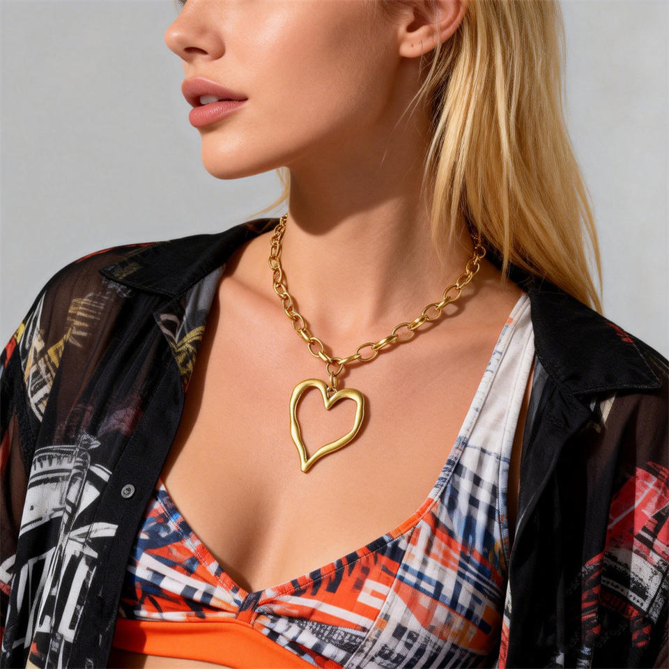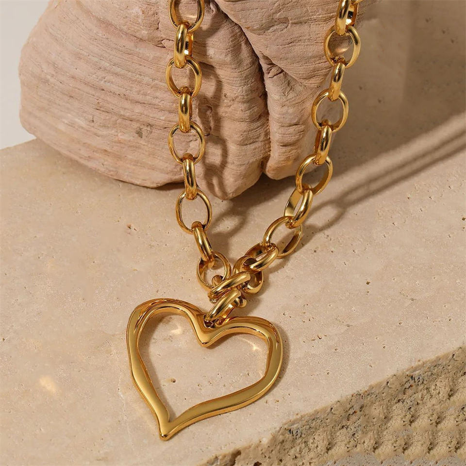 Collana da Donna con Catena Spessa in Acciaio Inossidabile e Ciondolo a Cuore Grande Traforato, Gioiello alla Moda Impermeabile 18K di Tendenza