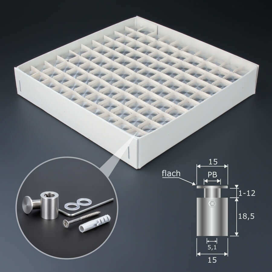 Confezione da 100 fissaggi per insegne pubblicitarie in acciaio inox V2A grezzo Ø 15 mm WA: 18,5 mm PS: 1-12 mm