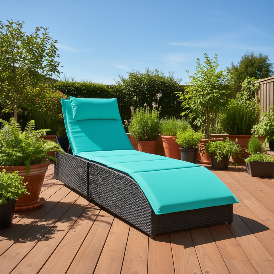 Lettino Prendisole Pieghevole in Rattan PE Nero con Cuscino, Sdraio da Esterno per Patio, Design Moderno