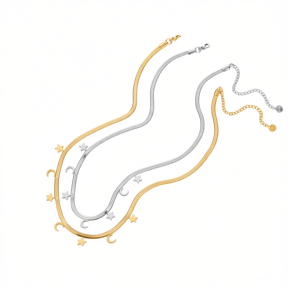 Collana con Ciondolo a Forma di Stella e Luna in Oro, Argento e Acciaio 46898