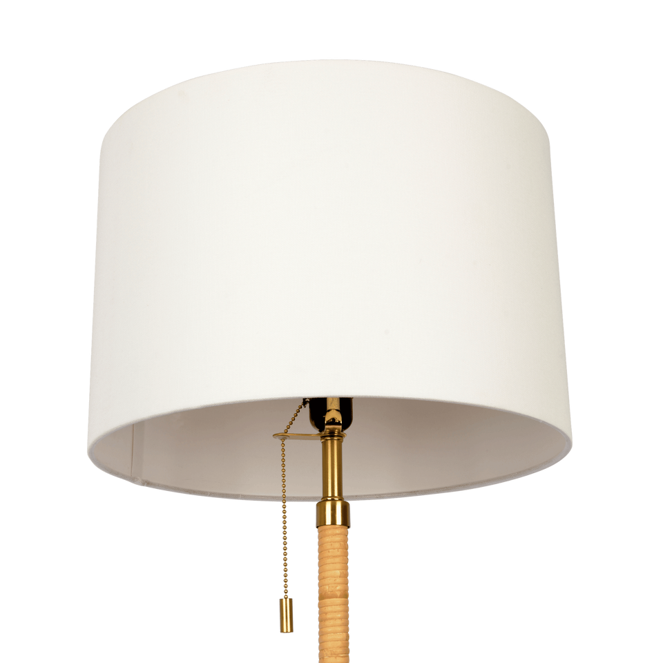 Stellar Wood Rattan Tube Floor Lamp with Gold Brass Metal and White Linen Shade