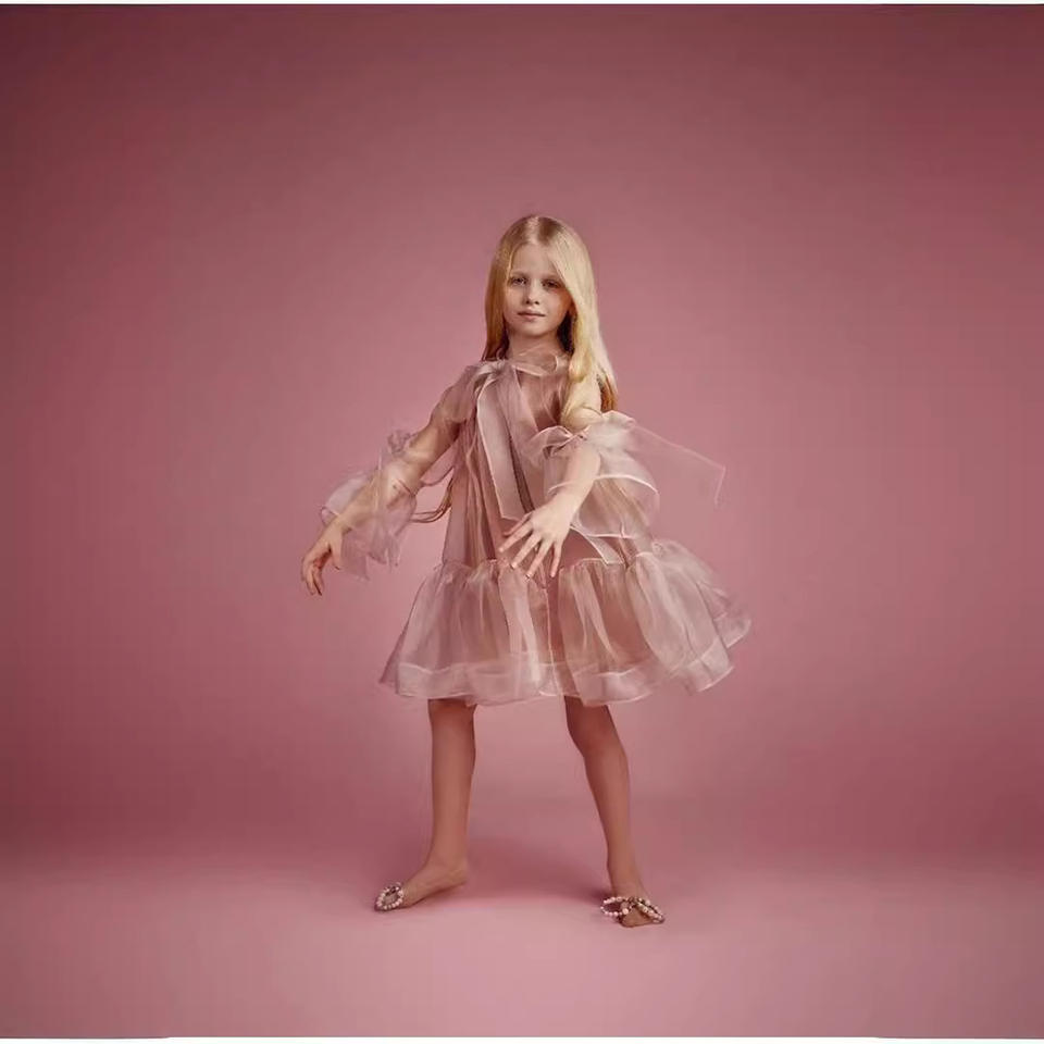 Stock Girls Tulle Dress for Kids Long Sleeve Chiffon Ball Gowns for Birthday Prom Baby Girl's Summer Prom Dress Decorated Bow