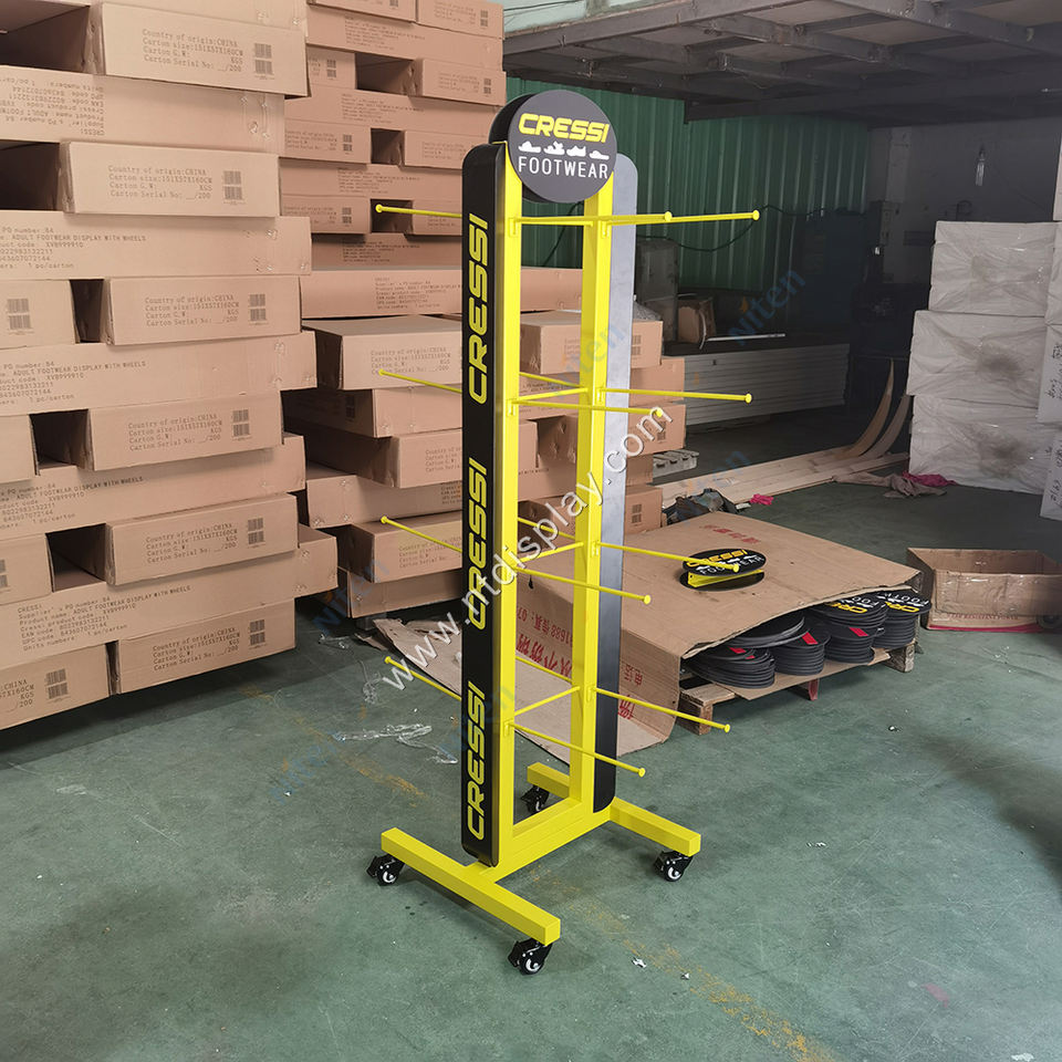 Negozio POP girevole appendiabiti da pavimento in metallo portatile Showroom scarpe da esposizione