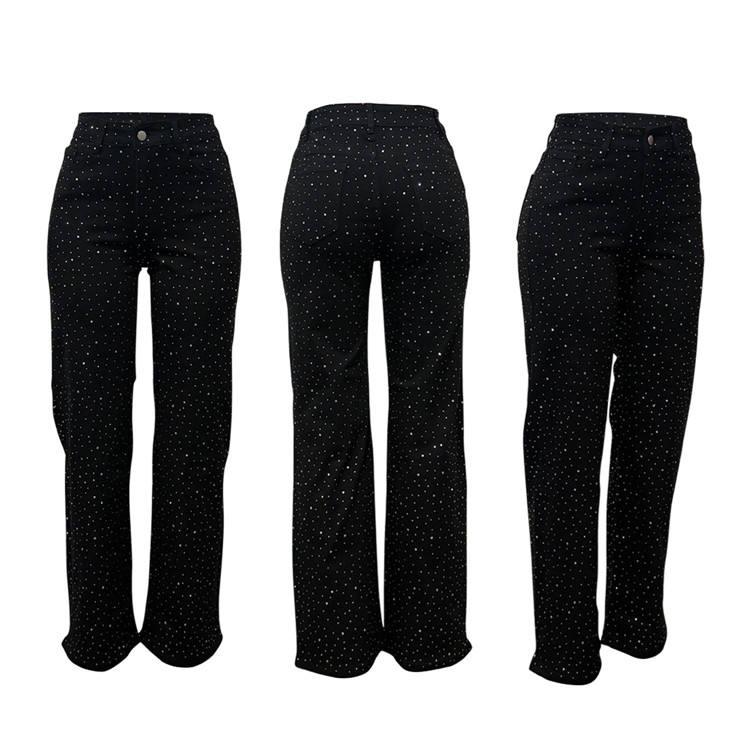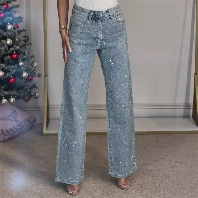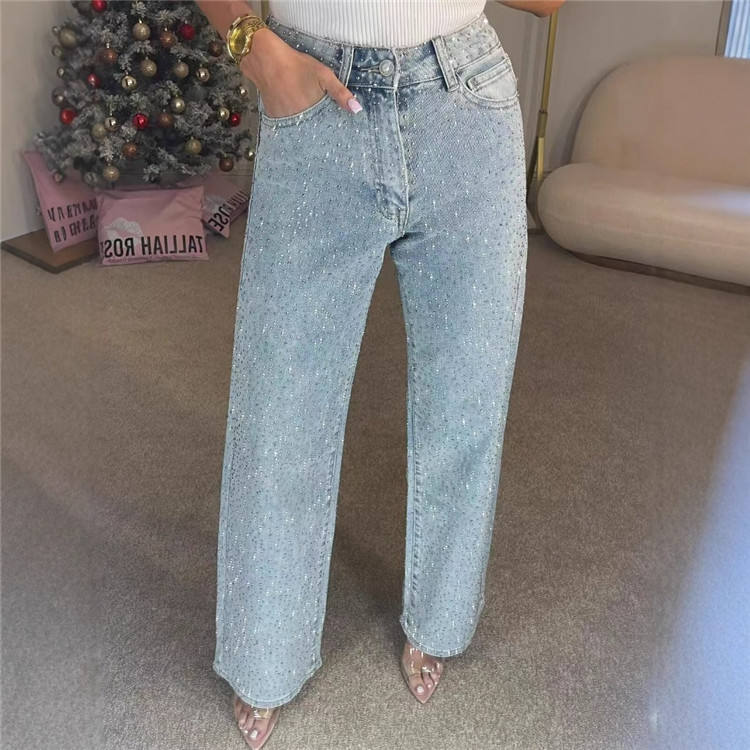 Straight Jeans for Women Diamonds Pants Stretch High Waist Washed Distressed Pockets Vintage Denims Streetwear Female Trousers
