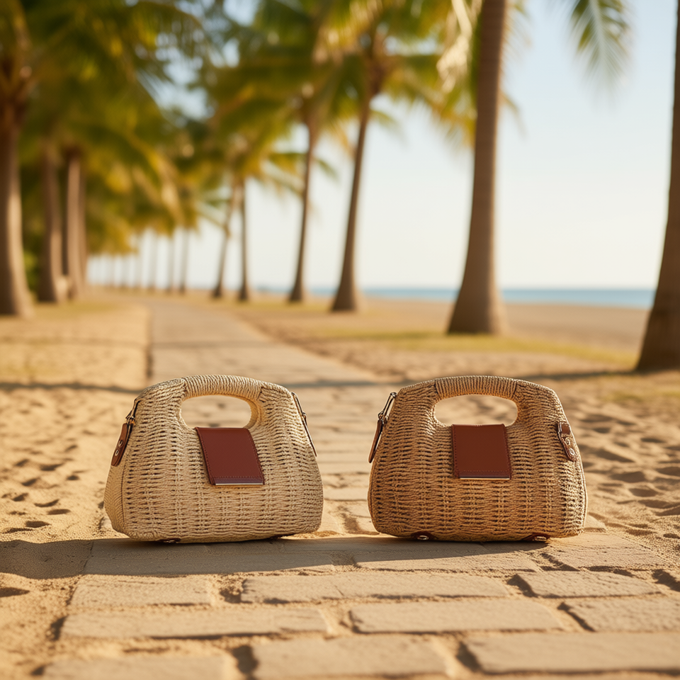 Borsa a mano rigida in paglia intrecciata 22x17cm con manico superiore e dettagli in pelle da donna
