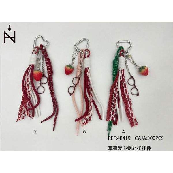 Portachiavi a Forma di Cuore con Fragola, Nappa in Pizzo e Ciondolo per Borsa o Accessorio Chiave