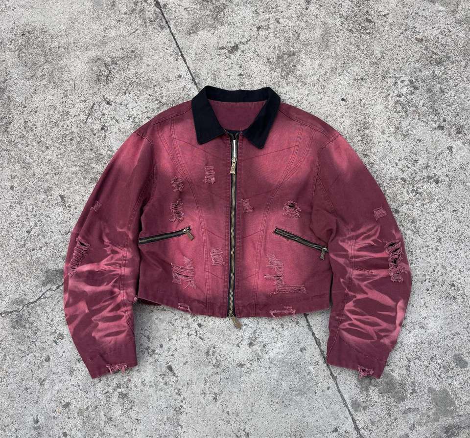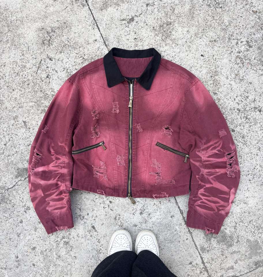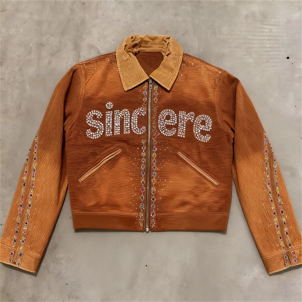 Giacca da Lavoro Detroit in Denim e Tela per Uomo, Stile Streetwear Personalizzato, Effetto Vintage con Diamanti e Strass, Chiusura a Zip