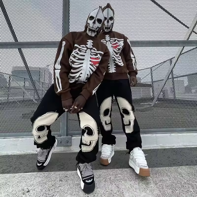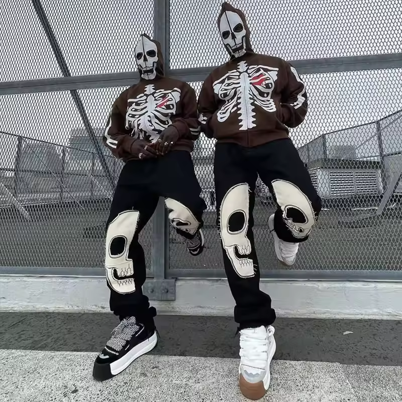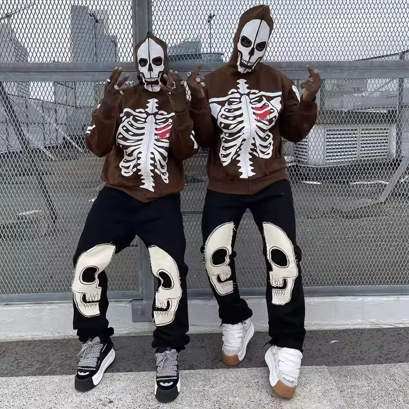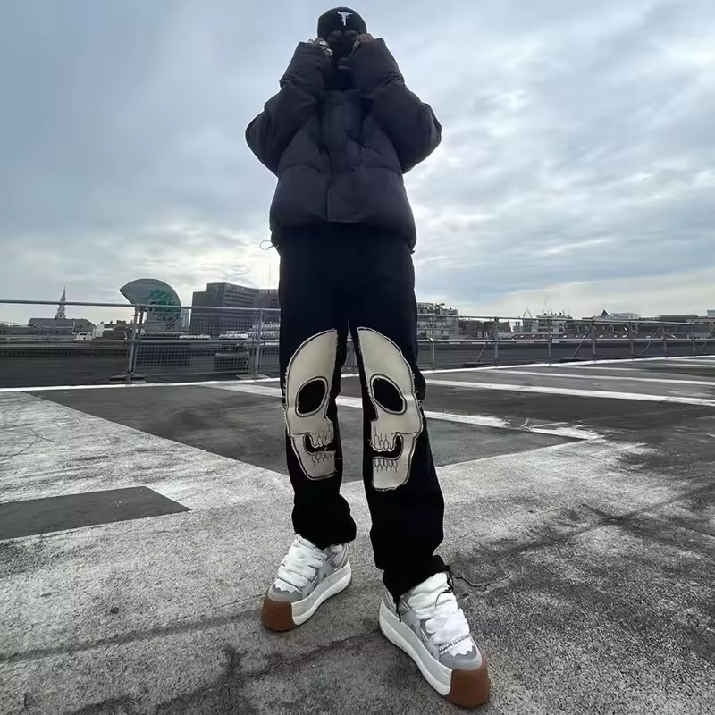 Streetwear Mens Cotton Trousers Sweatpants Custom Men Skull Patchwork Patch Embroidery Fleece Stacked Pants Hoodies Men