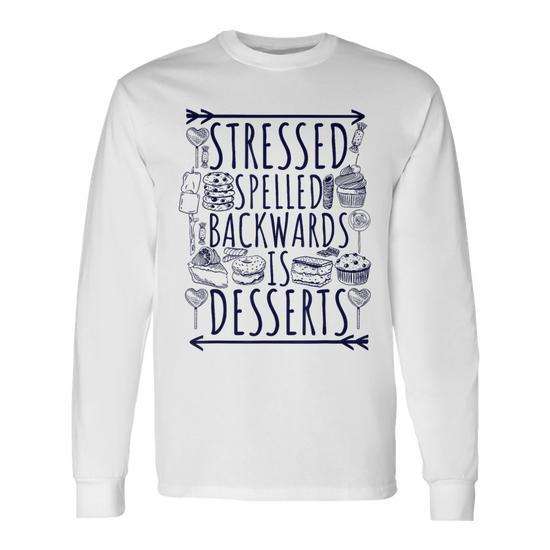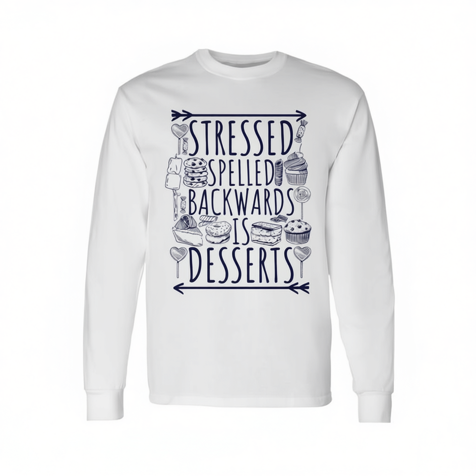 T-shirt a maniche lunghe con stampa 'Stressed Spelled Backwards Is Desserts' e design 'Sweet Love Sign'
