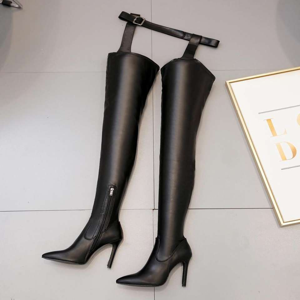 Stretchy Black Pu Belted Crotch Thigh High Boots Sexy Women Pointy Toe High Heels ZIP Summer Winter Boots Club