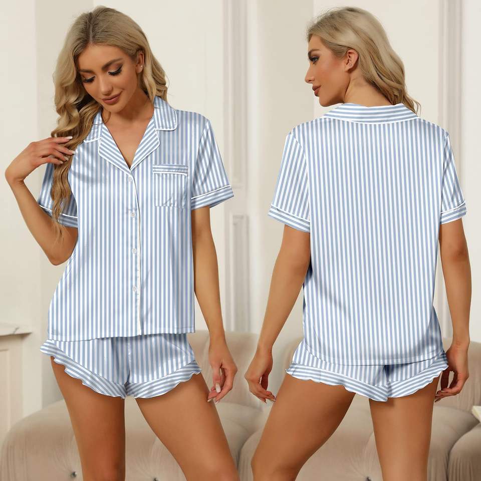 Striped Satin Silk Pajamas for Women 2Pcs Ruffle Notch Collar Button Short Sleeve Shorts Drawstring Closure Loungewear